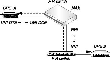UNI is the interface between an end-user and a network end point (a router or a switch) on the Frame Relay network. In a UNI-DCE connection, the MAX operates as a Frame Relay router communicating with a DTE device. To the DTE devices, it appears as a Frame Relay network end point. See Configuring a UNI-DCE interface.
