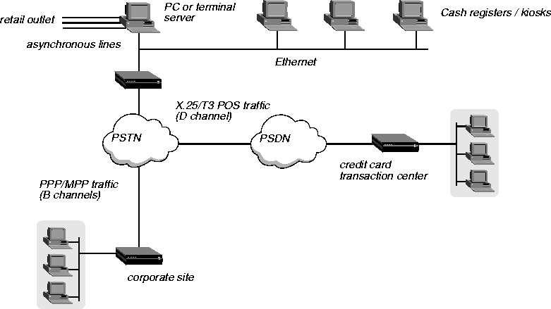 A typical use of T3POS performs credit card authorization over the D channel while using the B channels to transmit inventory control data and other traffic. Figure 6-4 is an example of T3POS setup.