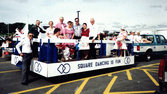 One of the more fun ways to make your club more visible is to make use of the Federation Trailer during the numerousFestivals around Nova Scotia each year. It is available to all clubs in Nova Scotia. The trailer or float has been used 16 times,mainly in the Annapolis Valley, and for the first time this summer, in the Halifax area. Some concern has been expressed aboutthe safety of the trailer, the cost of moving it to your area, and the difficulty in storing it until the next user picks it up. The trailerhas been designed to be very safe. It is built on a low platform, on six small house trailer wheels. Dancers are protected by sturdyguard rails and the dance floor is only one step up from the ground. It is safety inspected yearly, just like any other vehicle. Due toit's light weight, it can be towed by any vehicle capable of towing a small house trailer. It has it's own 110 V AC power supply forthe caller. The cost of moving and storing the trailer has been discussed by the trailer committee, and changes will berecommended to the Federation Executive. Decisions will be made at future Federation meetings. Why not come along andcontribute your suggestions, so you can make better use of your trailer? The more people who know about Square Dancing, themore dancers you'll get in your club!