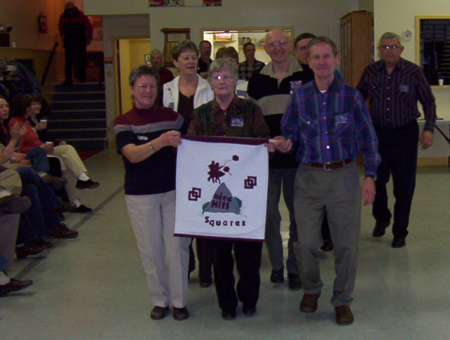 For the first time ever, Dice Hill Squares had their banner stolen. The West Kings Twirlers can soon expect a visit! Below: Inge Ruohoniemi, Dice Hill Squares, Shirley & Jim Robinson lead the parade!