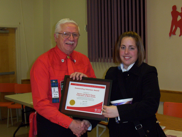 In addition to the excellent dancing and the entertainment, there was a serious purpose to the event. The attendees stepped forward and donated $1451 for the NS Heart & Stroke Foundation. This sum included the 50/50 draw winnings which were added to the pot. These monies were passed to the Heart & Stroke Foundation representative, Ashlyn Sulis, by Bob Ruohoniemi (below). Ashlyn thanked the dancers for their continuing generosity and expressed the appreciation of the Foundation for this annual donation.