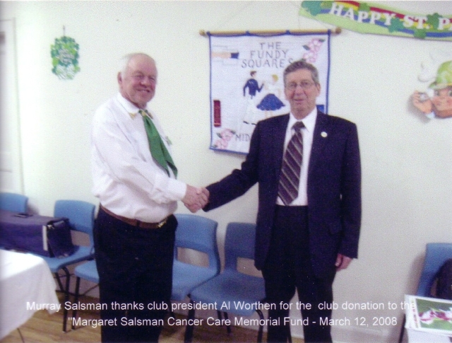 The Fundy Squares Dance Club held their annual “Pot Luck Supper & Benefit Dance” on the 12th of March. The club raised and donated $450 to the Margaret Salsman Cancer Care Memorial Fund. The funds were presented to Murray Salsman by Club President Al Worthen. Mr. Salsman attended the supper (see below) and spoke briefly on the good works the fund provides in the area. He is well known in the Valley as the operator of GLAD GARDENS where he raises Gladiolus to raise money for this fund. All money received goes to help cancer patients and their families in our area – aid includes drugs, food, oil, transportation, rent, mortgages, utilities and ambulance service. Referrals come from the “Cancer Care Patient Navigator” at the Kentville hospital.