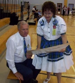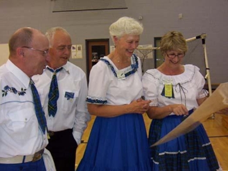 Strathmore Strutters: A year full of fun and good dancing on two nights a week this year: Monday - Mainstream, Wednesday - Plus. I don't believe they had a class last year (that gave Bob and Phyllis Tuesday off). The club continues to dance a combination of both levels on several nights over the summer with casual dress - two nights in May, June & July, one in August. Full Canada Day celebrations started at 2 p.m. and featured a potluck supper, games, swimming and dancing. It was a busy schedule when combined with all the demands farmers face in the summer. Two couples received Longevity Awards this year (see below): Morley & Edith Dillman, Bob & Phyllis Fiddes. At the time of this report, Bob & Phyllis were enjoying themselves with a well deserved trip to Great Britain.