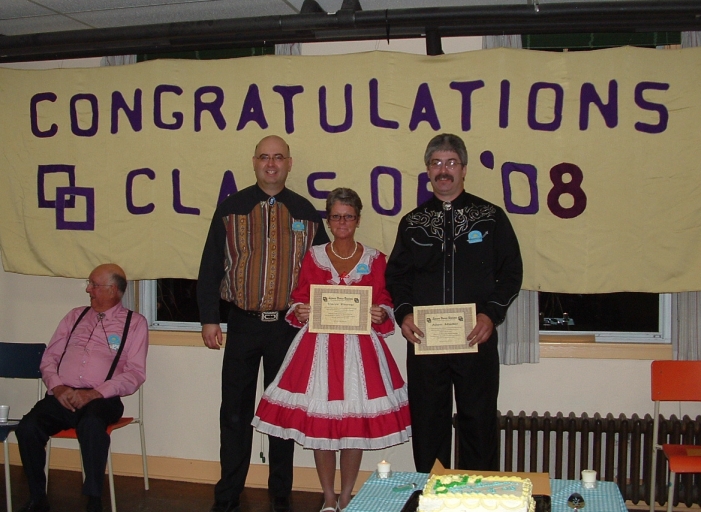 ABOVE: Caller Neil Dorey with Caro Plomp and Allen Mader at our graduation ceremony.