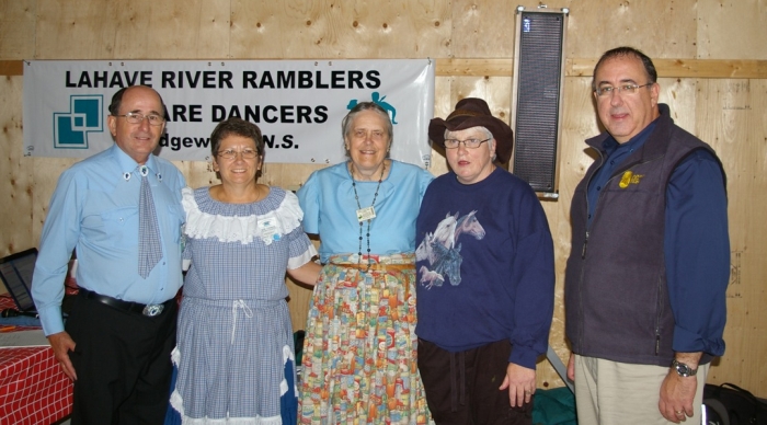 The LaHave River Ramblers, assisted by caller Dottie Welch, joined Bonny Lea Farm on 23 September 2011 to celebrate the opening of their new mulch barn. This picture was published the following week in the Lunenburg County Progress Bulletin - a nice bit of publicity!