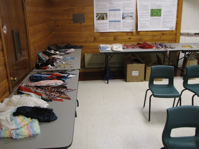 At the end of the evening, items remaining were moved to the regular coat racks so that the club coat racks could be dismantled. All items were divided in three groups: the most attractive were saved for next year and taken home by me, perfectly good square dance clothes were packed up to give to another club, and the rest was to be delivered by Marion and Gerry to an upcoming church rummage sale.