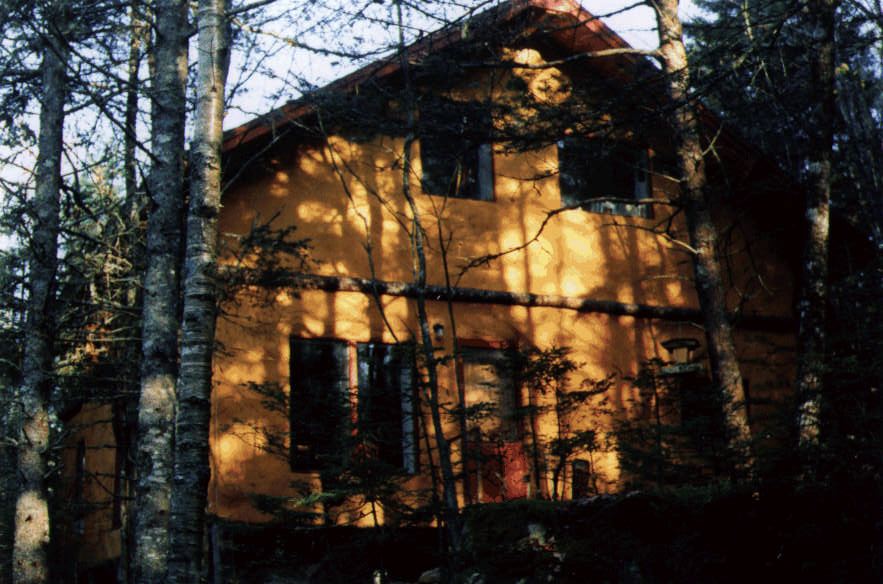 We built Nebraska style; two stories, 25' x 30' (interior dimension), seven bales high on the main floor and three on the second with an exposed cathedral style roof. The rafters in the roof being 6" x 6" timbers, supported by still barked soft wood trees, which were cut from the property, carrying rigid R20 insulation. The building sits very much in the trees, (much to the chagrin of some working on the project, they always seemed to "be in the way") back from a little road that winds up from the highway, overlooking one of Nova Scotia's myriad lakes, a hour east of Halifax.