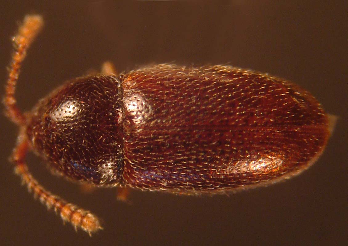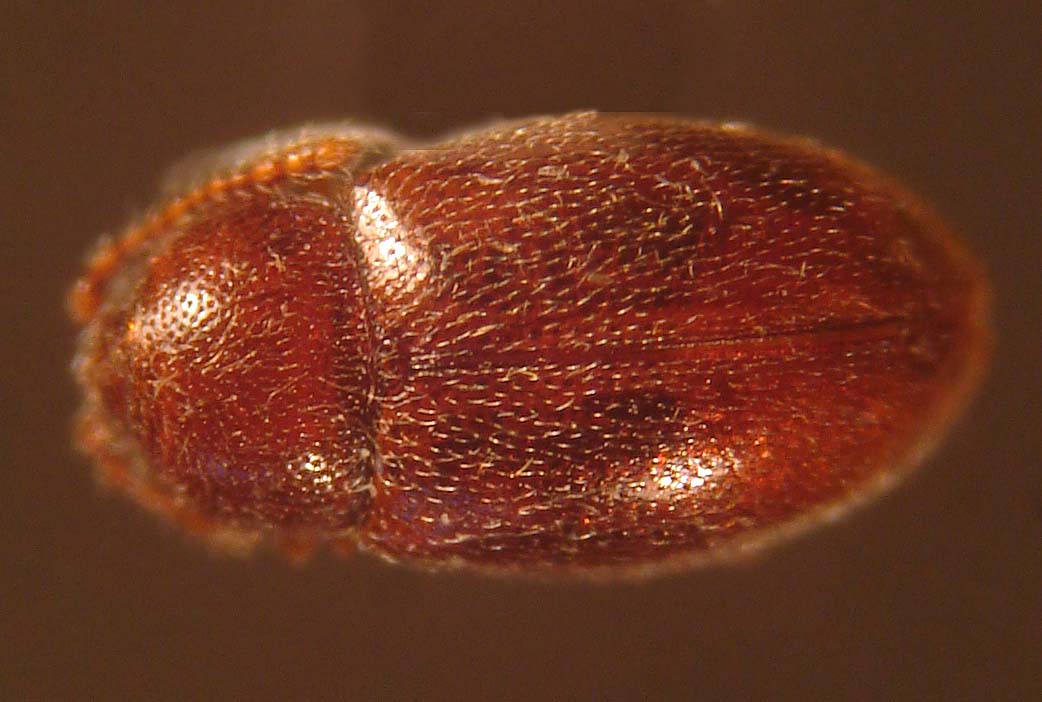 - 7(6). Antennomere 1 long, curved, 1.5-2.0 times as long as width of the antennomere at the apical end; much longer than antennomere 2. Lateral elytral margins evenly arcuate from widest point at middle. Body and elytra broad; width/length ratio of elytra 0.82, width/length ratio of body 0.53. Elytral setae somewhat erect and "bristling". 1.3-1.6 mm. ---- Atomaria lewisi Reitter