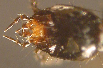 Gabrius microphthalmus (Horn) - 4.0-4.9 mm. Piceous black to black with elytra and apical margins of abdominal tergites more or less paler, rather piceous brown. Head, pronotum, and abdomen slightly iridescent. Maxillary palps piceous with last segment paler; labial palps dark brown; antennae piceous-black, basal three segments inconspicuously paler. Legs testaceo-brunneous with medial faces of all tibiae (front tibiae sometimes excluded) darkened. Head rounded quadrangular. Scutellum densely punctate. Dorsal rows of pronotum with 6 (occasionally 5 or 7) punctures.