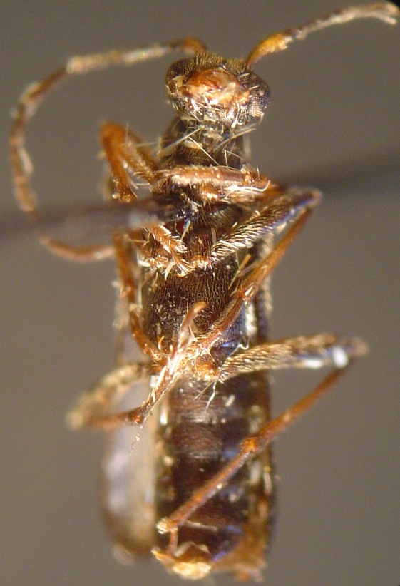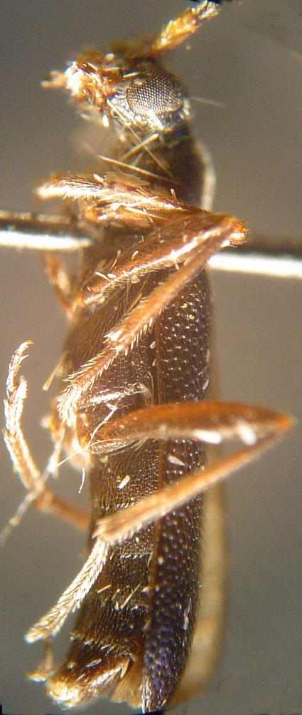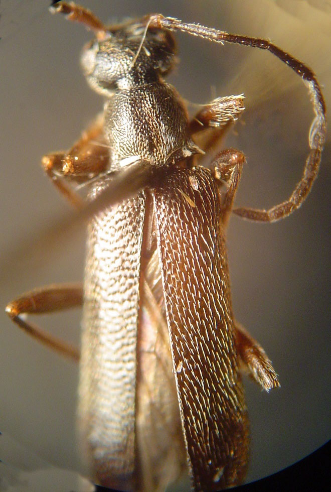 It is 4.4 mm in length and largely piceous in coloration. The temporae of the head narrow to a punctate neck. The antennae are long and each antennomere is cylindrical, much longer than wide. Antennomere 2 is short; antennomere 1 is rufous in colouration. The apical mandibular palpomere is blunt at the tip. The eyes are significantly emarginate behind the antennal insertions.