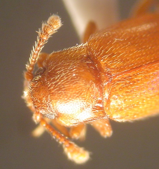 It is a small beetle (Bousquet & Leschen (2002) report 2.0-2.2. mm in length, although the specimen from Lorne (a female) is almost 2.4 mm in length) which is distinguished by the greatly expanded ninth antennomere of the male and two pairs of fovae at the base of the pronotum. For subcoxal fovae are present on the first visible abdominal sternite.