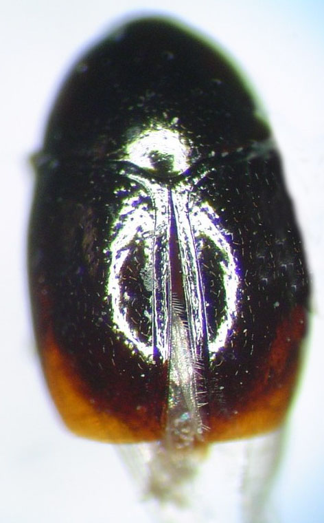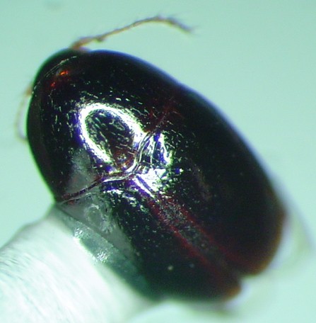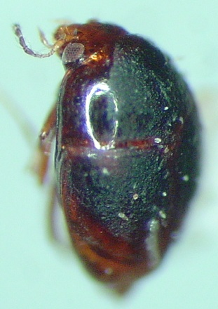 Small species: 1.15-1.2 mm. Dark brown to black; apex of elytron paler. Antennomere 2 shorter than 3 & 4 combined; 3 shorter than 4. Tip of scutellum exposed; punctation even and fine. - Baeocera indisctincta Löbl & Stephan