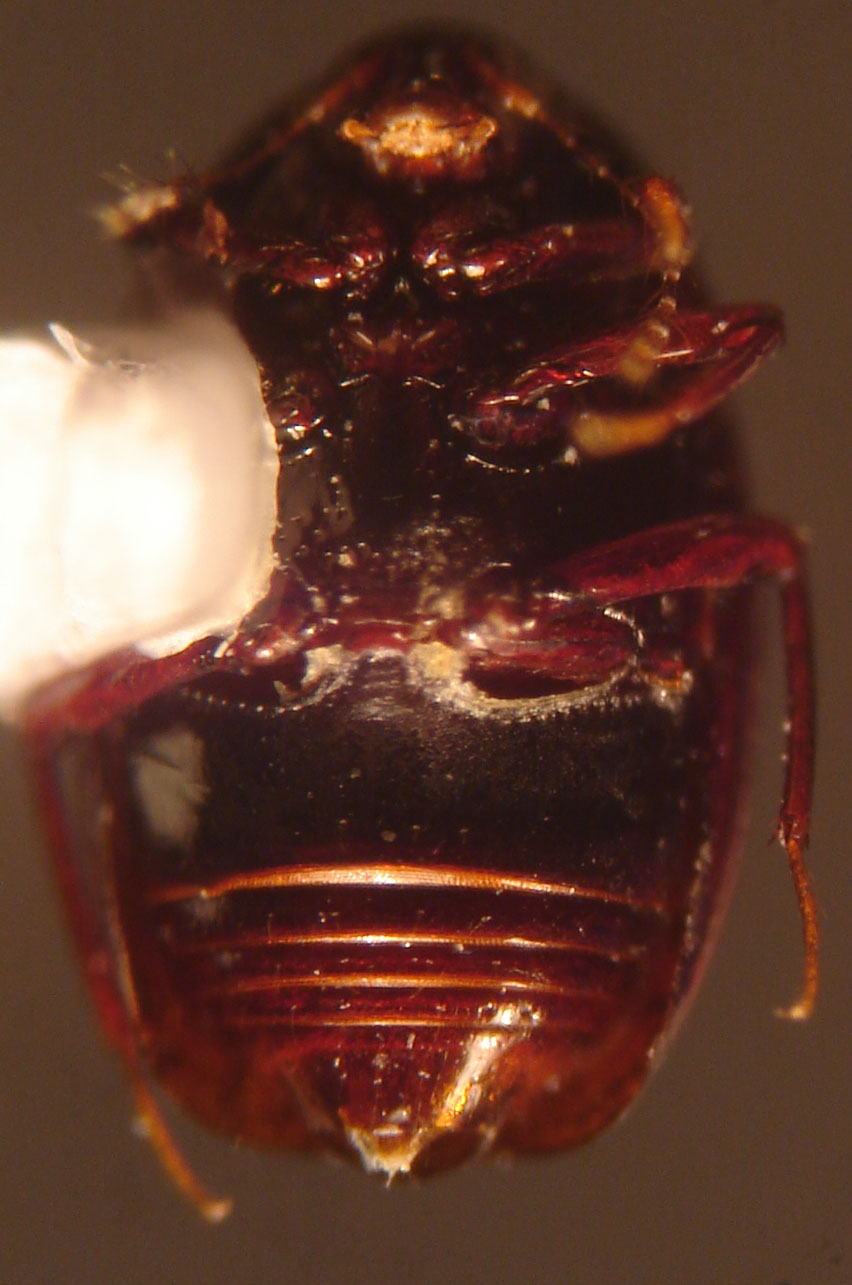 Mesepimera very small, in some indistinctly defined; coxal plate on first sternum large, extending to middle of sternum. Body entirely pale rufotestaceous. Head, pronotum, & metasternum vaguely punctate; elytra finely, sparsely punctate. 1.7-1.9 mm - Scaphisoma rubens Casey.