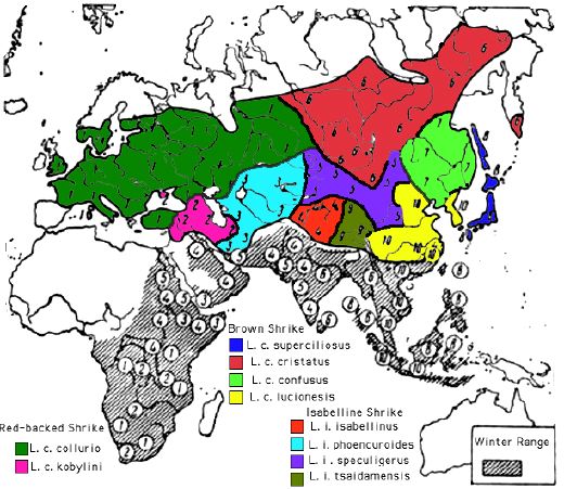 Adapted (below) is a range map that shows (roughly) the breeding territory of the ten subspecies of these three Shrikes. Note that, in general the subspecies of Red-backed Shrike winter in southern and eastern Africa; the subspecies of Isabelline Shrike winter in eastern Africa, Arabia and India & Pakistan; while the subspecies of Brown Shrike winter from eastern India across south-east Asia through Malaysia and Indonesia.