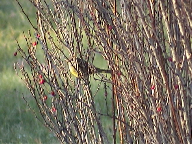 The bird was often seen in the barberry hedge which runs along the front and west side of 6667 Jubilee Road. I observed it feeding by moving along the length of the hedge, also moving to the forsythia bush that is in the front yard. From there it several times moved to a large hedge that is in the back yard of 1720 Bloomingdale Terrace. The back yard of this house is separated from the previous by a large stone wall and it perches there, flying in an out of the hedge. It also forgaed low down amongst the lower limbs of the lilac bushes that separate the two yards.