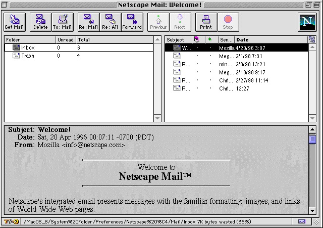 Below is an illustration from a Netscape Mail window. Two mailboxes are shown in the left frame of the window, an 'In Box' and a 'Trash Box'. Just like in PINE you can create multiple mailboxes to organize your correspondence.