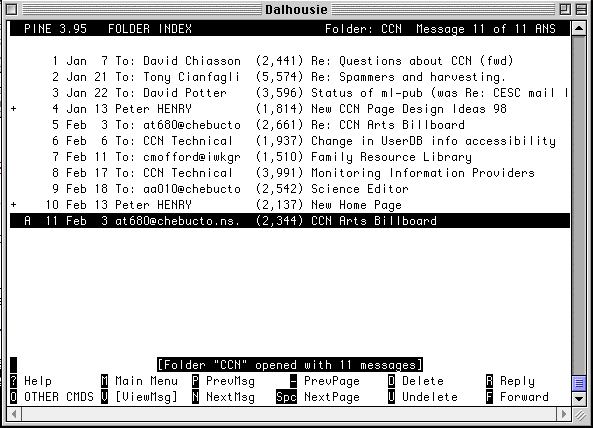 Below you see an example of a mailbox in PINE, a text-based Email program. You'll notice that there are a number of messages arranged in chronological sequence and numbered. For each one PINE tells me who it is from, the size (in kilobytes) of the message and its subject. Once I select any of the messages (the highlighted one in dark is the one which is currently selected) I can carry out any of the functions listed in the menu bar below. I can reply to it, delete it, forward it, move my selection point up or down in the menu, etc.