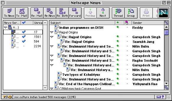 Dans l'exemple ci-dessus, (tiré du groupe soc.culture.indian), vous voyez une série de messages dans le fil de discussion Rajiput origins (origines Rajiput), suivie d'un nouveau fil de discussion appelé Brahminist History and Society (histoire et société brahmanique). Tout comme dans le courriel, l'abréviation Re: signifie qu'il y a une réponse à un message précédent.