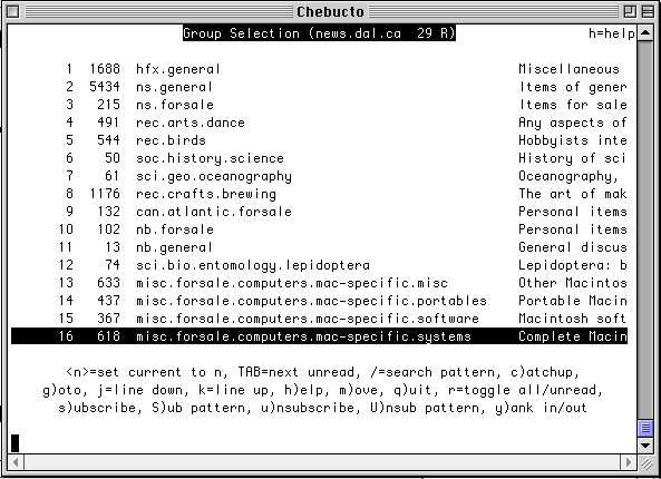 Une fois dans Usenet, vous n'avez plus qu'à sélectionner un groupe de discussion et à faire défiler les messages qui s'affichent pour lire ceux qui vous intéressent. Avec TIN, vous vous 'abonnez' aux groupes qui vous intéressent. Lorsque vous accédez à la fenêtre principale de TIN, vous apercevez une liste de ces groupes.