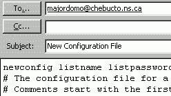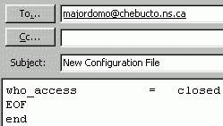 Last time we took a look at the basics of a list server and its uses. Let's delve a little deeper this time and see how we can make it work for you. The rest of the article will deal specifically with Majordomo and its configuration since that is the list server software that CCN is running. If you ended up here without reading Part I, I'd suggest you go back and browse through it before continuing. The key to using Majordomo is learning the list commands and the configuration options. The commands allow you to set up your list or your subscription to the list and the configuration options tell Majordomo how to run your particular list. There are many Majordomo commands but the easiest and most useful is "help". If you send email to majordomo@chebucto.ns.ca with the single word "help" (without the quotes) in the message area you get the help file sent back to you. The help file gives you lots of useful information if you are a member of a list or if you wish to become a member. If you are a list owner however, you have a different set of commands available, most of which are accessed by making changes to the configuration file. By changing various settings in the configuration file you can change the way the list behaves. This is what I was referring to in Part I when I said that there were many different types of lists because lists are really all the same - it'’s just the behaviour that differs. The configuration file is quite large so I'm not going to go into detail on every line item but I would like to hit the high points. Feel free to refer to it while you read. Here is a sample for you to examine. Note that any line starting with a pound sign ("#") is a comment. This means that the first fifty-some-odd lines are comment lines explaining some of the features of the configuration file. Some Important ParametersThe most important parameters are the passwords. A person who has access to your passwords can change the options on your list and/or gain control of it. There are two passwords: the administrative password, admin_passwd, and the approval password, approve_passwd. You should guard these passwords with your life or at least (archival link Password Safe from archive link Counterpane Systems.