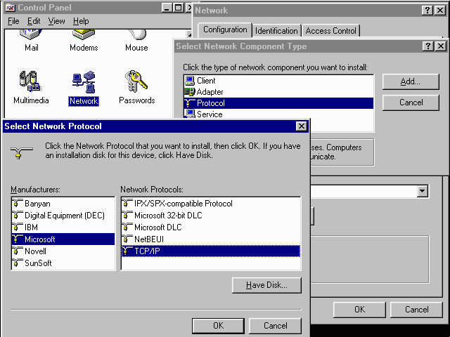 2.3 If TCP/IP is not listed, click on Add button, double click on Protocol,, click on Microsoft in the Manufacturers list, then double click on TCP/IP in the Network Protocols list. You may be prompted for the Windows CD-ROM or disks.
