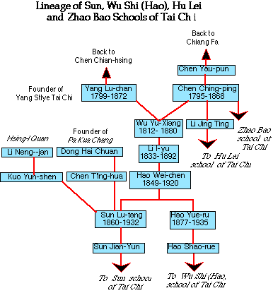 Wu Yu-xiang had only one prominent student, his nephew Li I-yu (1833- 1892) who, in turn passed his art on to Hao Wei-chen (1849-1920). One of his students was his son, Hao Yue-ru (1877-1935) who continued to teach the Wu Shi (or Hao) style of Tai Chi.